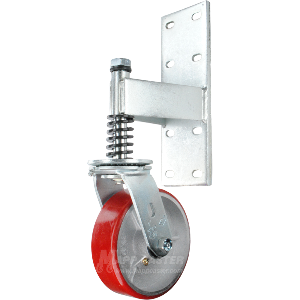 Heavy Duty Spring Loaded Gate Caster Bracket with Poly on Iron Wheel - Part # 7QSL76-PU